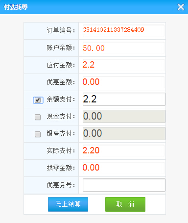 點擊結算圖標,將彈出付費找零對話框,點擊馬上結算可完成此掛單消費: