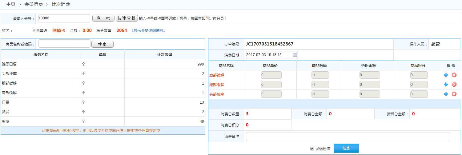 通過(guò)刷卡,或者通過(guò)查詢定位到會(huì)員,然后在左側(cè)選擇服務(wù)類型商品進(jìn)行計(jì)次消費(fèi) 如下圖: