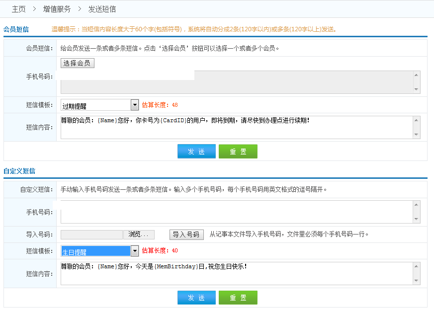 發(fā)送短信:給會員發(fā)送祝福、通知短信等等.     注意:當短信內(nèi)容長度大于65字符,系統(tǒng)將會自動分成2條或者多條短信發(fā)送...